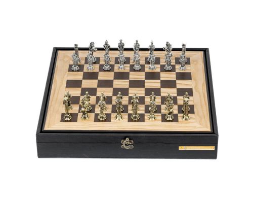 Olive Wood Chess Set in Black Wooden Box and Metallic Chess Pieces Roman Theme